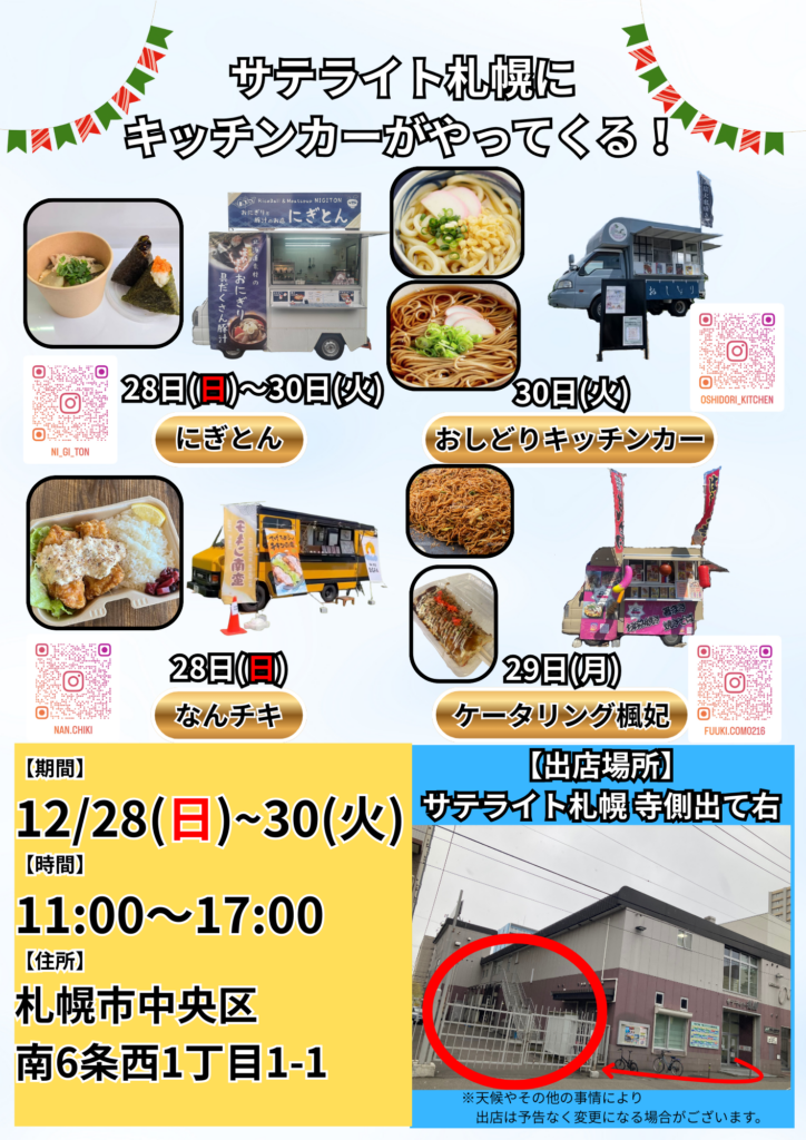 news サテライト札幌にキッチンカーがやってくる! Play Pause Unmute Mute サテライト札幌×Aiba 札幌中央 2025年12月18日 Share: Facebook X 12/28(日)~12/30(火)の3日間サテライト札幌にキッチンカーがやってきます!KEIRINグランプリを楽しんでいる中で遠くまでご飯を買いに行かなくても大丈夫!詳細は下記画像をご覧ください!